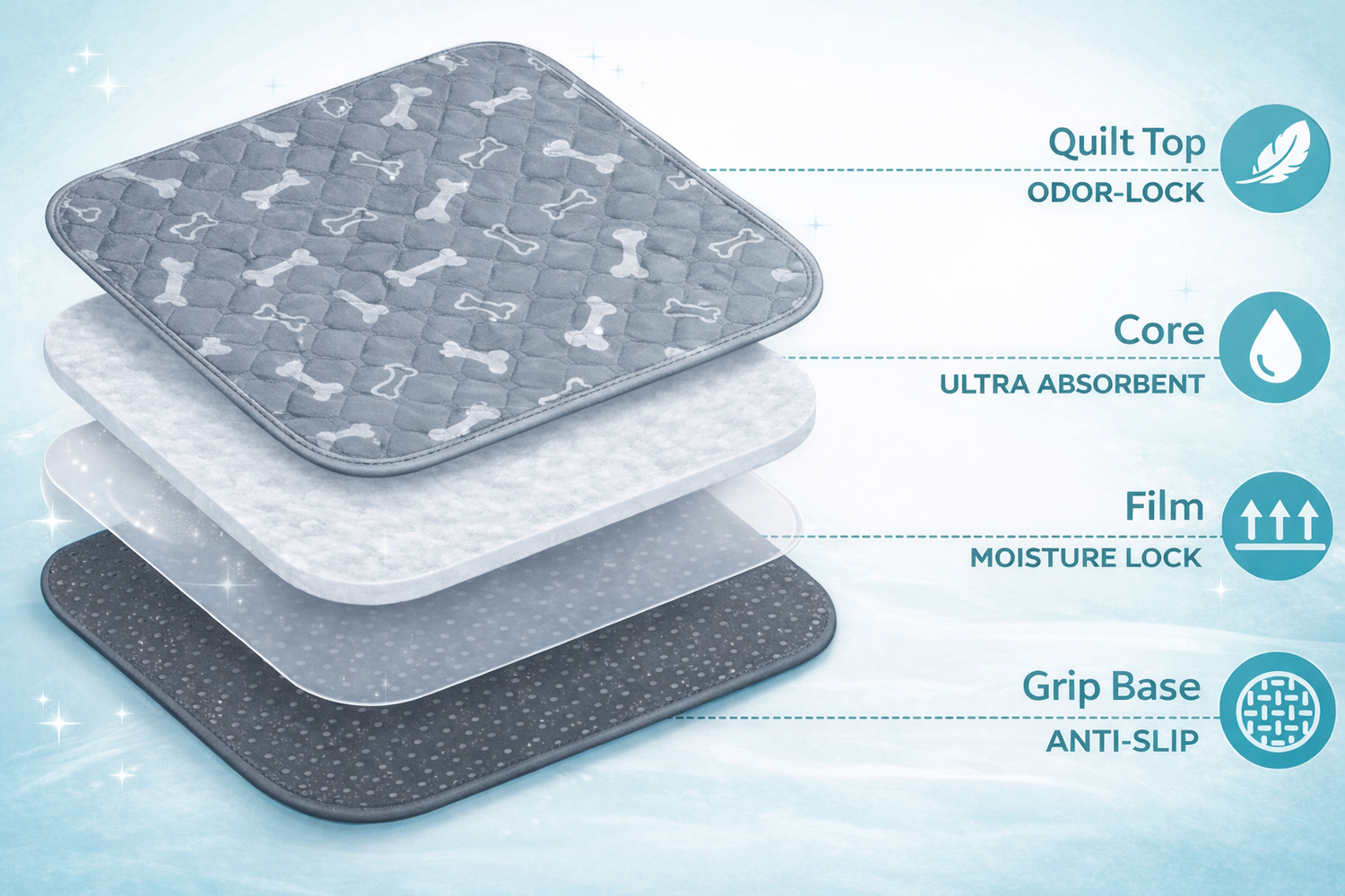 Most washables are just cloth. This system uses a dense-fiber matrix designed to encapsulate liquid molecules, helping reduce evaporation into ammonia (odor), while the Quick-Wick hydrophobic top layer supports “dry paws.”